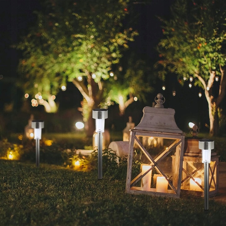 Nasz zestaw srebrnych lampek solarnych LED to świetna dekoracja do Twojego ogrodu. Umieść oświetlenie ogrodowe na rabacie lub wzdłuż ścieżek, by oświetlić ważne miejsca. Wybierz najbardziej nasłonecznione miejsce i wbij paliki do ziemi. Miejsca z dużą ilością słońca umożliwiają całkowite naładowanie się lamp solarnych w ciągu 6 godzin. Po całkowitym naładowaniu, lampy do ogrodu LED powinny świecić również przez 6 godzin i zadbać o wyjątkowy nastrój na twojej imprezie w ogrodzie.
