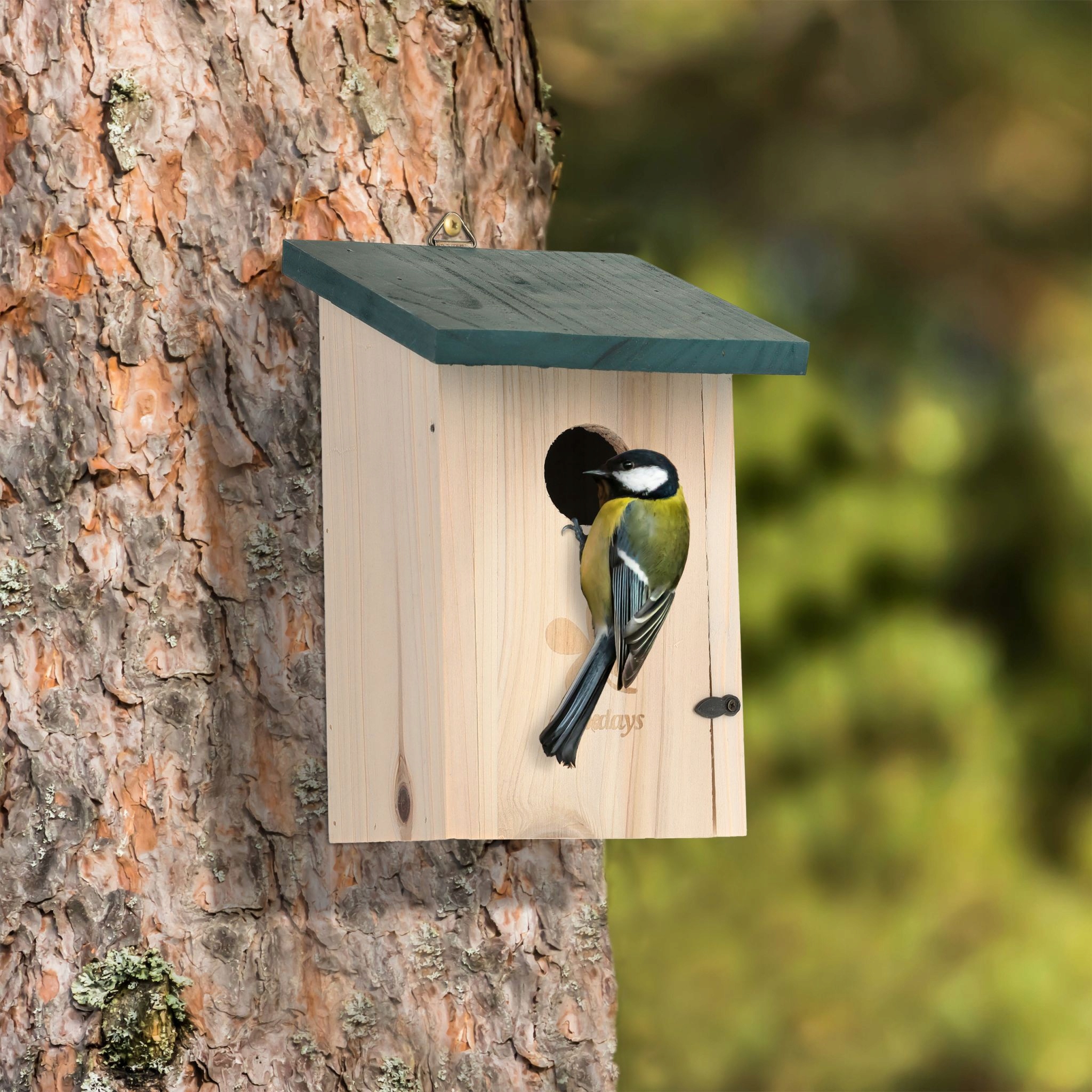 Dzięki tej budce dla ptaków możesz pomóc dzikim ptakom. Urocza budka lęgowa z zielonym dachem pomaga mniejszym ptakom takim jak sikorki czy wróble w bezpiecznym wychowaniu potomstwa. Małe okienko o średnicy 3,5 cm sprawia, że ptaszki bez problemu schowają się przed deszczem i wiatrem. Wytrzymały domek dla ptaków wykonany jest z nieimpregnowanego drewna jodłowego. Dodatkowo budka lęgowa dla ptaków posiada drzwiczki na zawiasach, dzięki czemu można łatwo wyczyścić karmnik dla sikor po sezonie lęgowym.