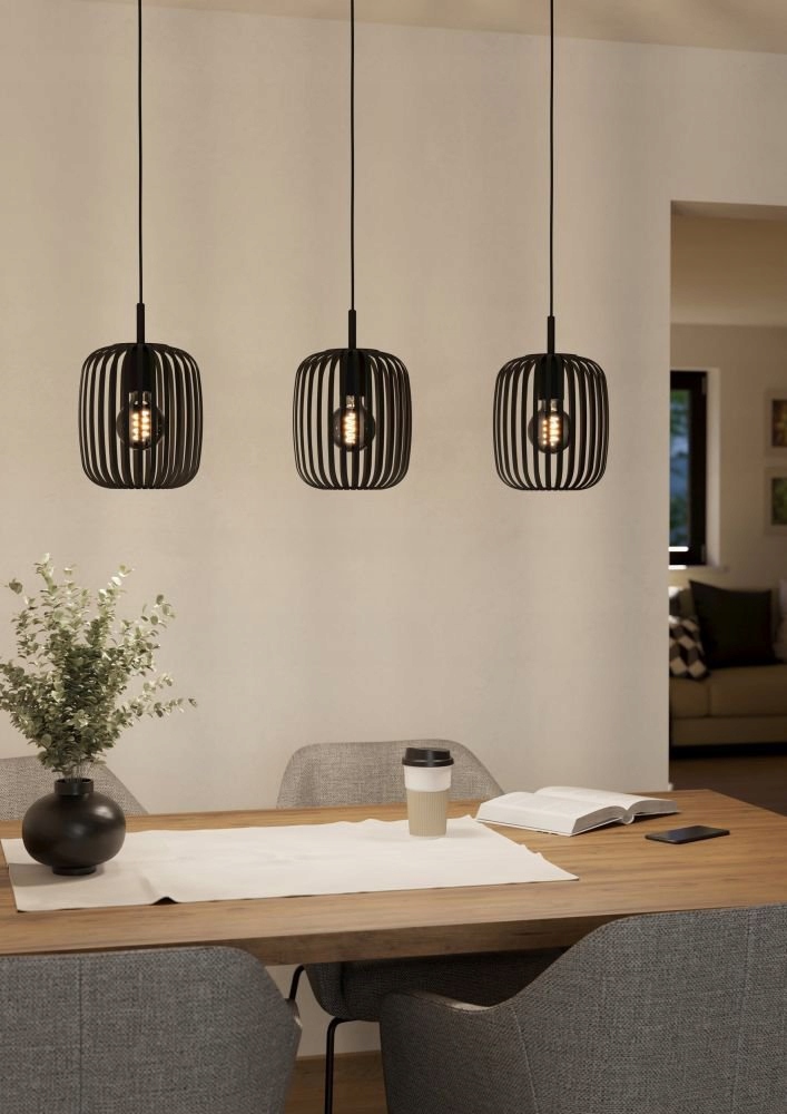 Lampa wisząca ROMAZZINA składa się z trzech okrągłych kloszy wykonanych z czarnych płaskich metalowych pasków. Metalowe paski tworzą fascynującą grę światła i cienia, gdy tylko lampa jest włączona. Lampa wisząca w stylu New Nordic Design płynnie komponuje się z nowoczesnymi obiektami. Oferuje nowoczesny design do każdego pomieszczenia – czy to w kuchni, w salonie czy też w jadalni nad podłużnym stołem jadalnym.  Lampa pasuje do każdej żarówki z trzonkiem E27.