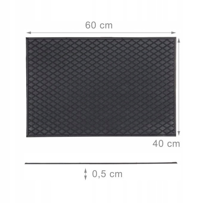 Gumowa wycieraczka zapewniająca komfortowe czyszczenie podszew butów Antypoślizgowa wycieraczka gumowa jest idealna do stosowania zarówno na zewnątrz jak i wewnątrz pomieszczeń. Umieść matę na balkonie, tarasie lub przed drzwiami wejściowymi. Wykorzystaj matę do utrzymania czystości w swoim domu. Woda po prostu spływa z powierzchni odpornej na wilgoć. Wycieraczka odporna na warunki atmosferyczne jest trwała i wytrzymała. Jeśli standardowy rozmiar 60 x 40 cm Ci nie odpowiada, możesz przyciąć gumową matę do pożądanego rozmiaru.