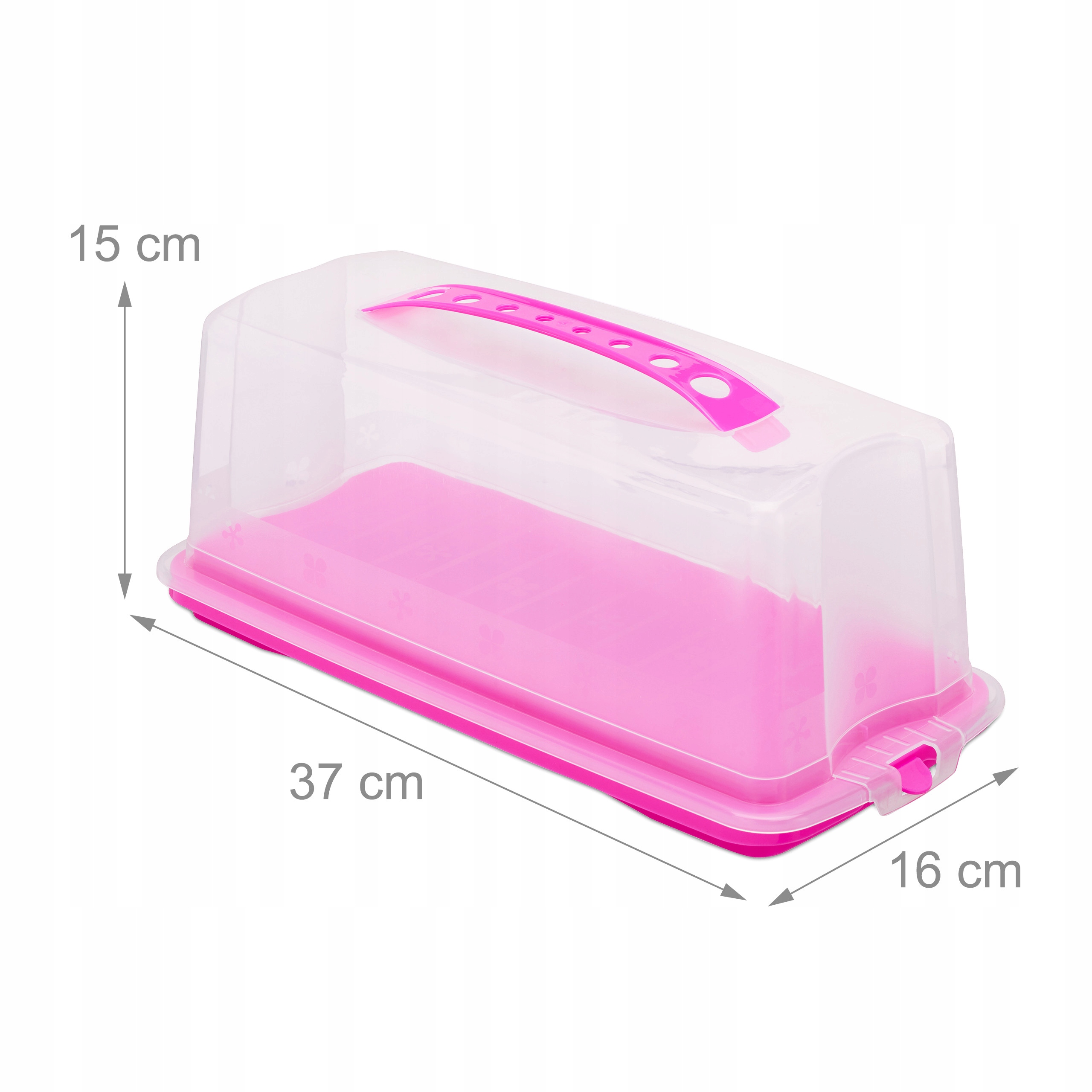 ✳️Zastanawiasz się, jak bezpiecznie przewieźć Twoje pyszne wypieki? Nasz pojemnik do transportu ciasta jest właśnie dla Ciebie! Połóż ciasto lub muffiny na spód pojemnika, przykryj pokrywą i zamknij zatrzaski. Dzięki temu Twoje ciasto zachowa świeżość oraz nie rozpadnie się podczas przenoszenia. Na podstawce narysowane są linie, które pomogą Ci pokroić ciasto na równe części. Podłużna forma pojemnika sprawdzi się idealnie do ciast o prostokątnym kształcie jak np. keks czy babka.