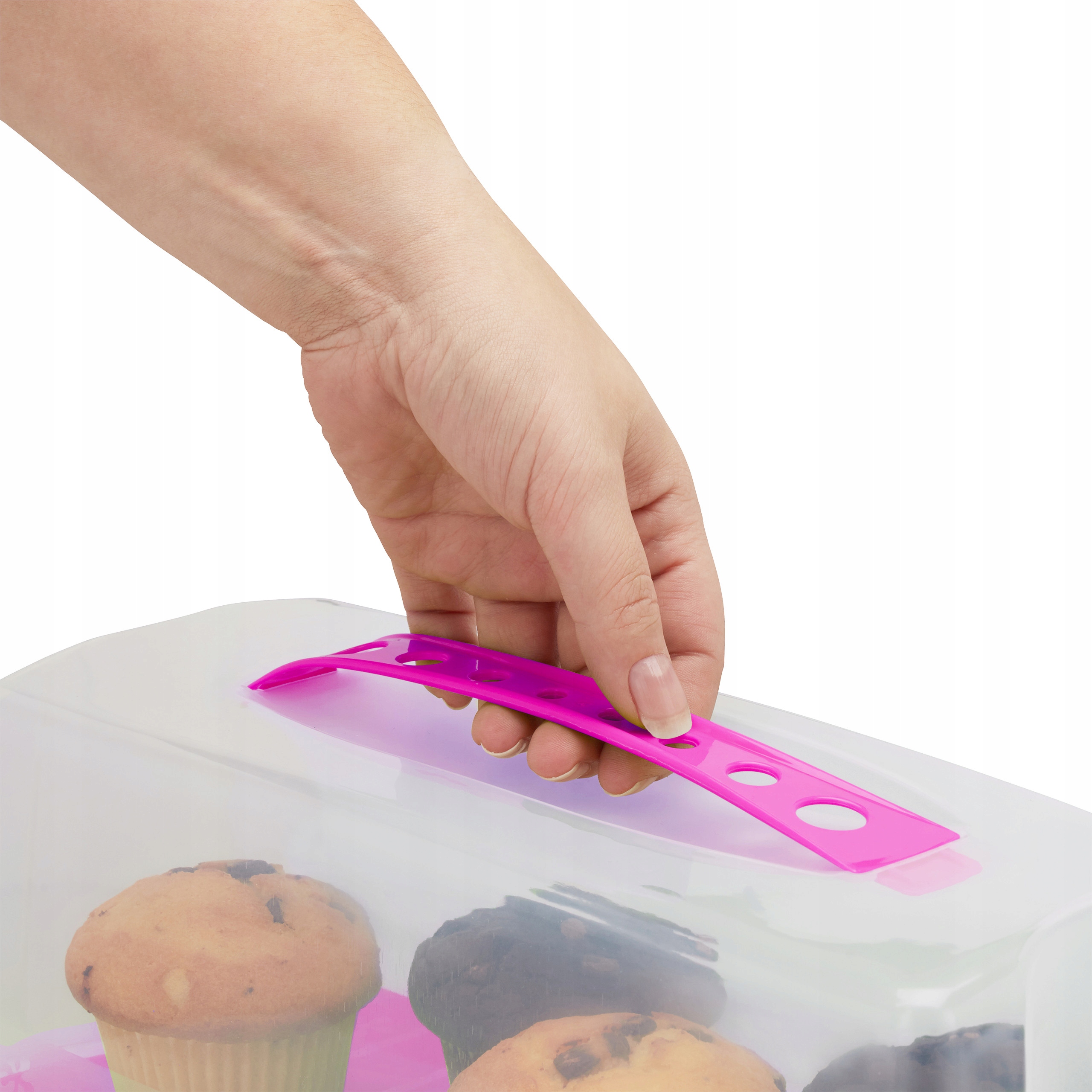 Zastanawiasz się, jak bezpiecznie przewieźć Twoje pyszne wypieki? Nasz pojemnik do transportu ciasta jest właśnie dla Ciebie! Połóż ciasto lub muffiny na spód pojemnika, przykryj pokrywą i zamknij zatrzaski. Dzięki temu Twoje ciasto zachowa świeżość oraz nie rozpadnie się podczas przenoszenia. Na podstawce narysowane są linie, które pomogą Ci pokroić ciasto na równe części. Podłużna forma pojemnika sprawdzi się idealnie do ciast o prostokątnym kształcie jak np. keks czy babka.