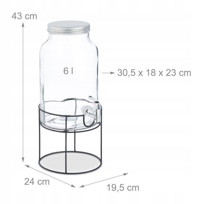 Ten dozownik do lemoniady jest idealnym dodatkiem do domowego baru lub następnego przyjęcia w ogrodzie. Szklany słój posiada wyjmowany wkład na owoce lub kostki lodu. Domowe soki, lemoniadę, wodę i drinki można łatwo dozować za pomocą kranu. Dzięki przykręcanej pokrywce zawartość pojemnika na sok jest chroniona przed owadami i brudem.