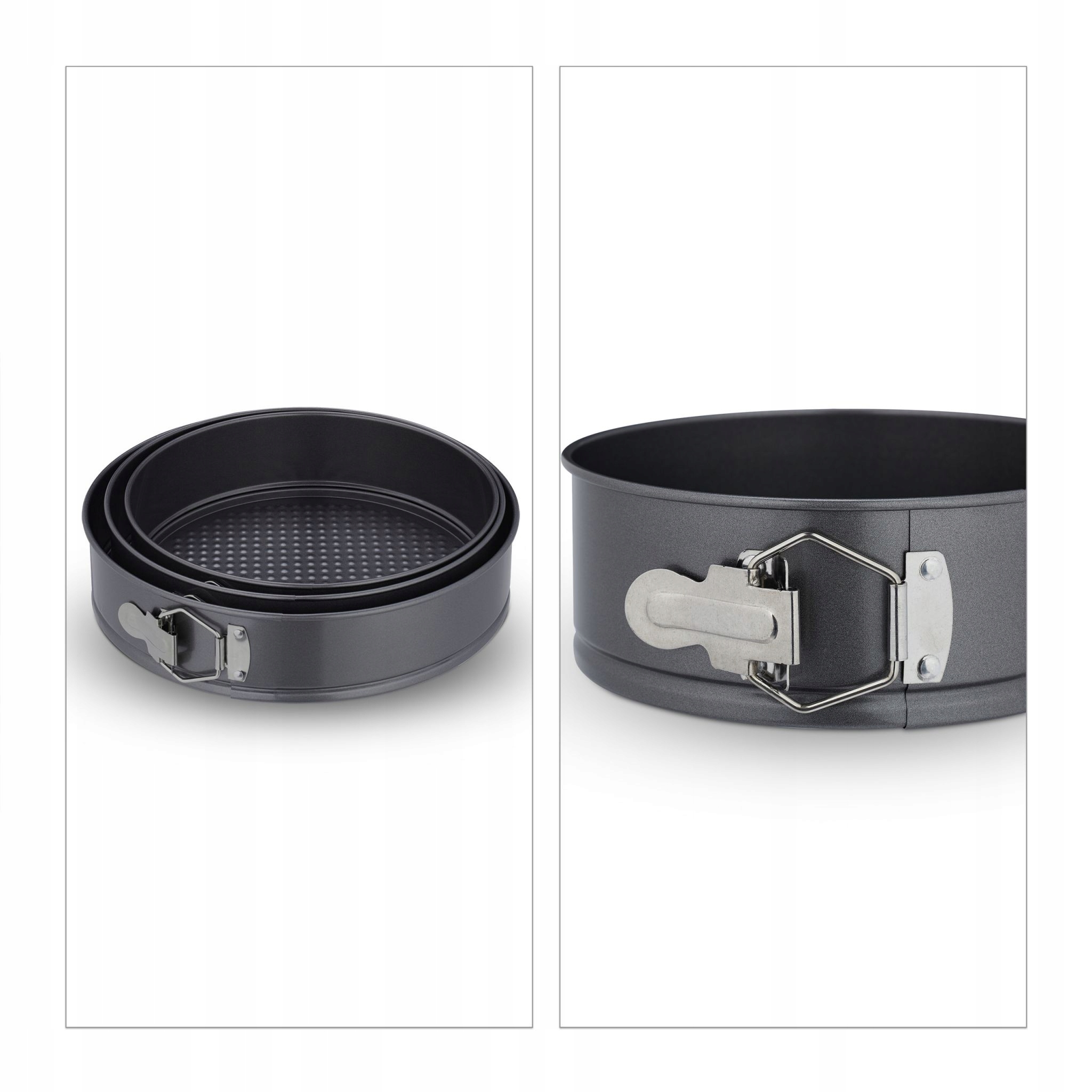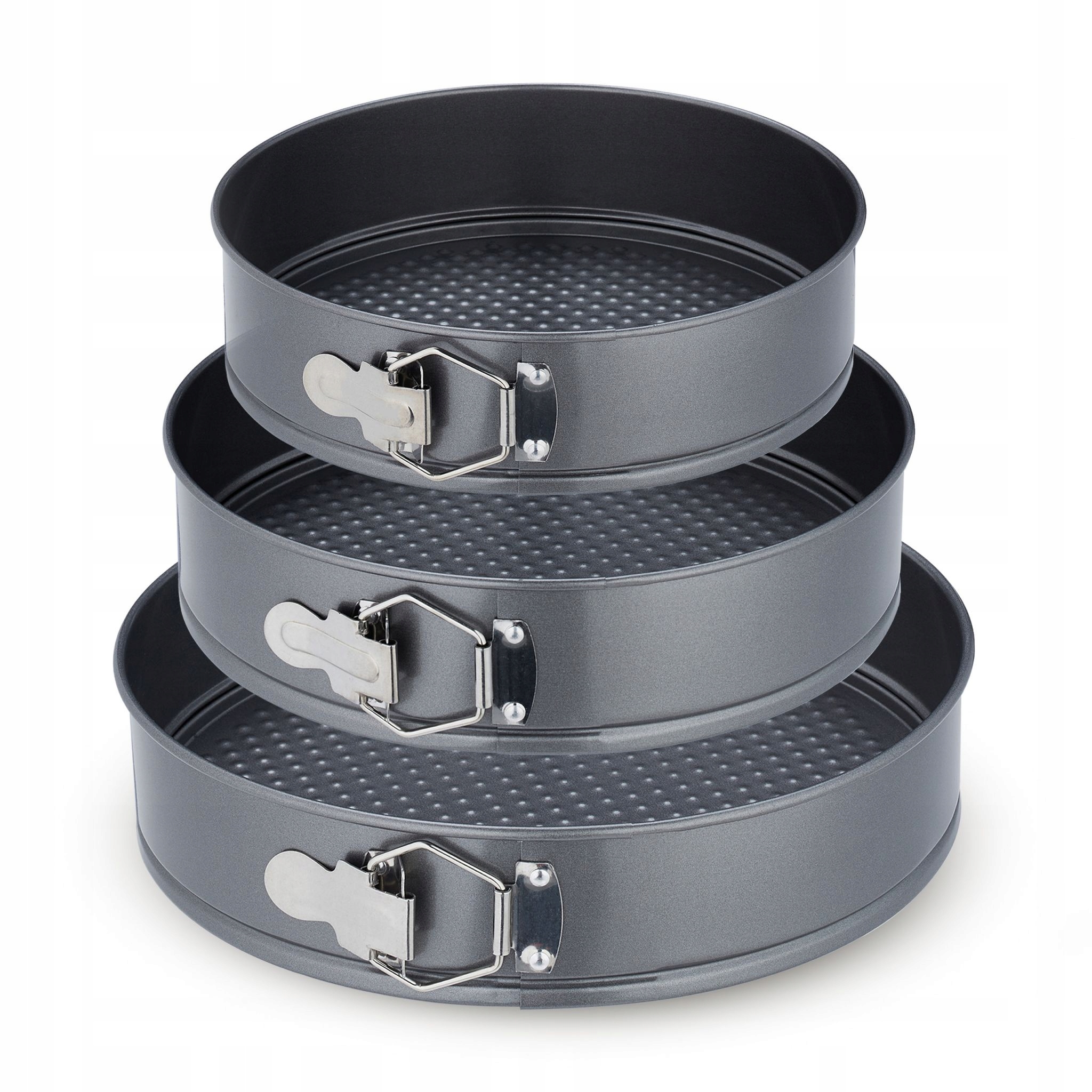 Marzysz o przygotowaniu doskonałych wypieków dla swojej rodziny i znajomych? Nasz zestaw trzech okrągłych form do pieczenia to niezastąpiony pomocnik w kuchni. Dzięki różnym rozmiarom łatwo dobierzesz formę idealną do liczby gości, a nawet stworzysz imponujący, trzywarstwowy tort. Formy świetnie sprawdzą się do pieczenia soczystych ciast owocowych, czekoladowych brownies czy wilgotnych spodów tortowych. Wyjątkowe klamry ułatwiają wyjmowanie wypieków, gwarantując wygodę i perfekcyjny efekt.