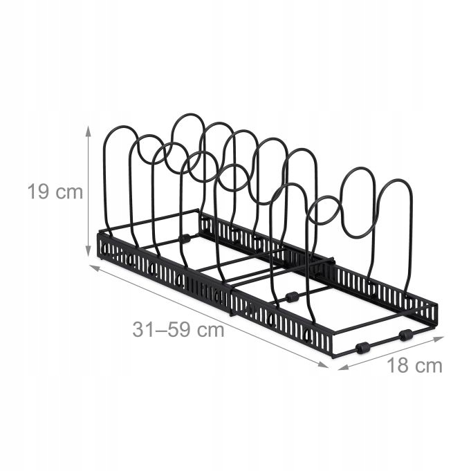 Wysuwany uchwyt na naczynia Uchwyt na patelnie, garnki, pokrywki i naczynia Zapewnia porządek w szafkach i na szafkach kuchennych Wystarczy wyciągnąć i dostosować Stojak na patelnie z regulowanymi przegródkami do przechowywania W razie potrzeby uchwyt może być również używany pojedynczo Czarny uchwyt na pokrywki wykonany z wytrzymałego metalu Praktyczne zabezpieczenie antypoślizgowe zapewnia stabilność
