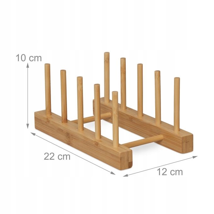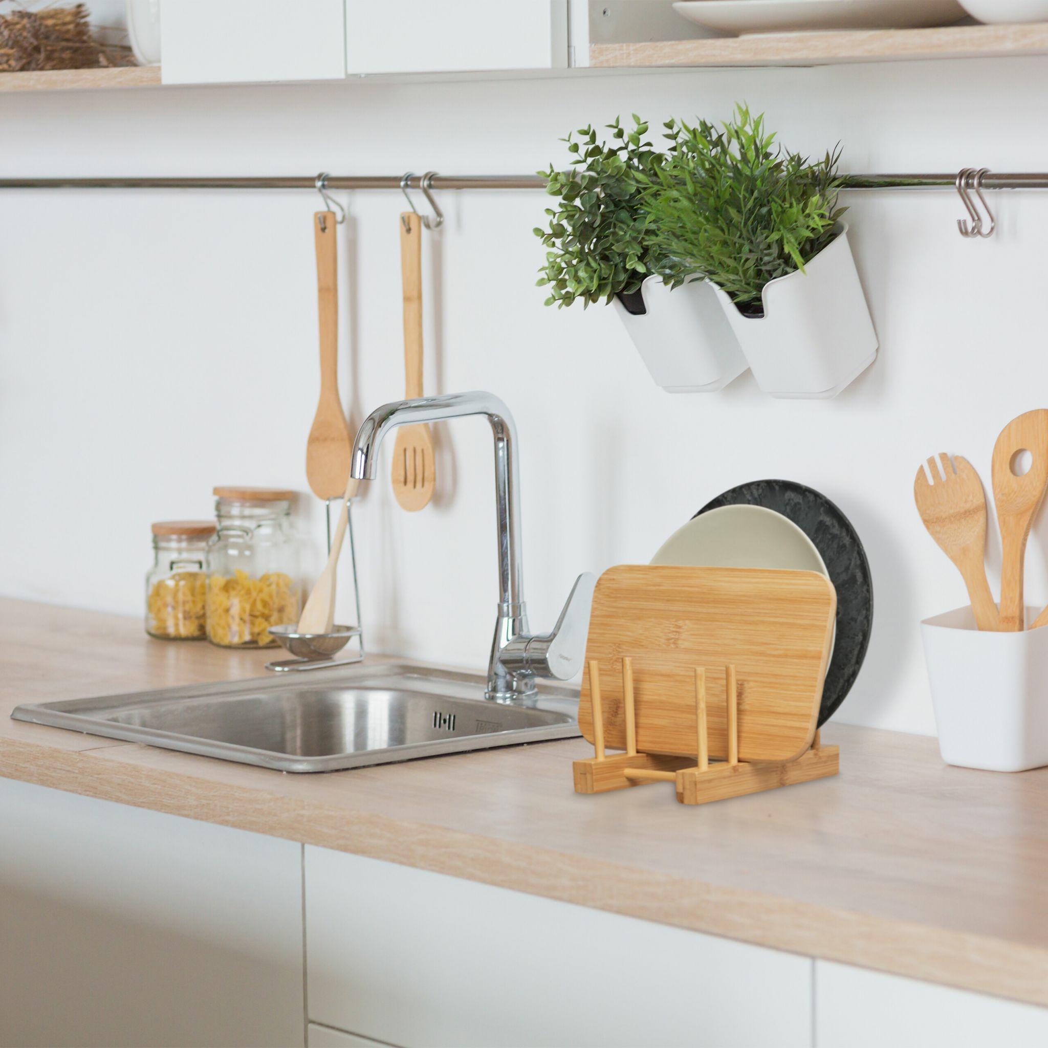 Zestaw 2 uchwytów na talerze zapewnia większą przejrzystość w szafkach kuchennych i szufladach. Każdy ze stojaków na talerze oferuje miejsce na 4 talerze, deski do krojenia lub pokrywki pojemników do przechowywania żywności, dzięki czemu są one szybko pod ręką, gdy są potrzebne. Stojaki na talerze są również idealne jako stojaki na naczynia, które są idealne dla pojedynczych gospodarstw domowych dzięki swoim kompaktowym rozmiarom. Dzięki bambusowemu wykończeniu, stojaki na talerze wprowadzą odrobinę naturalności do Twojej kuchni.