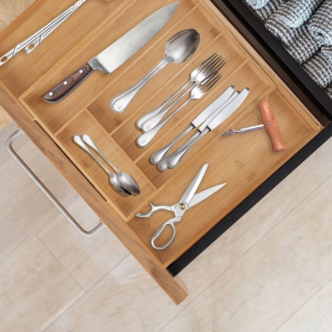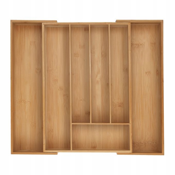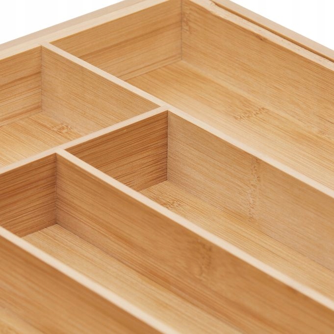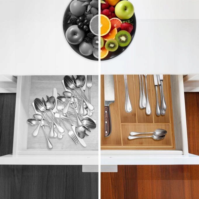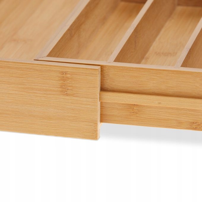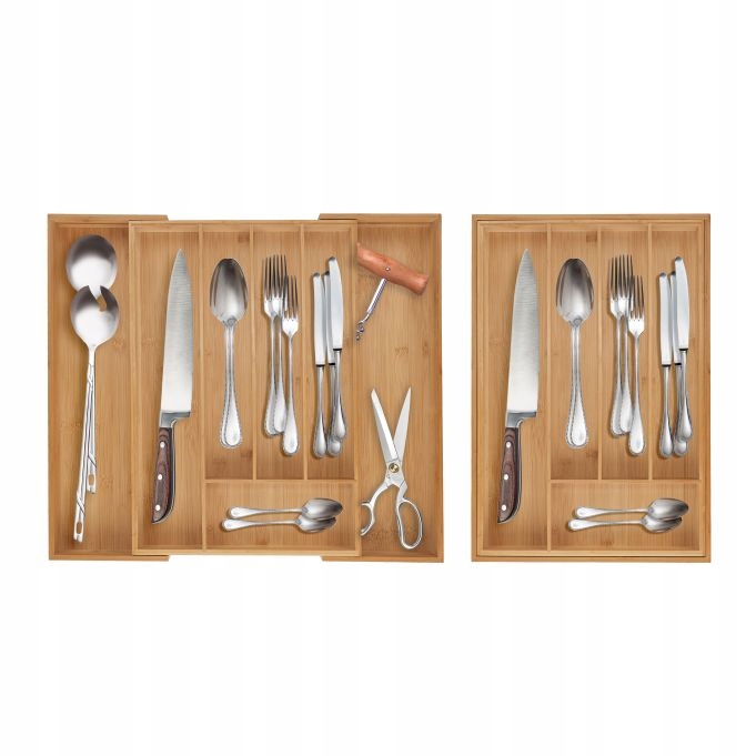 Zapomnij o bałaganie w kuchennych szufladach! Dzięki tej eleganckiej tacce na sztućce z naturalnego bambusa, chaos to już przeszłość. Przemyślany układ z wieloma przegrodami głównymi oraz 2 wysuwanymi sekcjami zapewnia nie tylko idealne miejsce na sztućce, ale również na wszelkie inne akcesoria kuchenne. To jednak nie wszystko! Organizer sprawdzi się także w biurze czy pracowni – uporządkuje przybory do pisania, materiały kreatywne i wiele więcej. Dodatkowo regulowana szerokość sprawia, że tacka perfekcyjnie dopasowuje się do różnych rozmiarów szuflad. Styl, porządek i funkcjonalność w jednym!