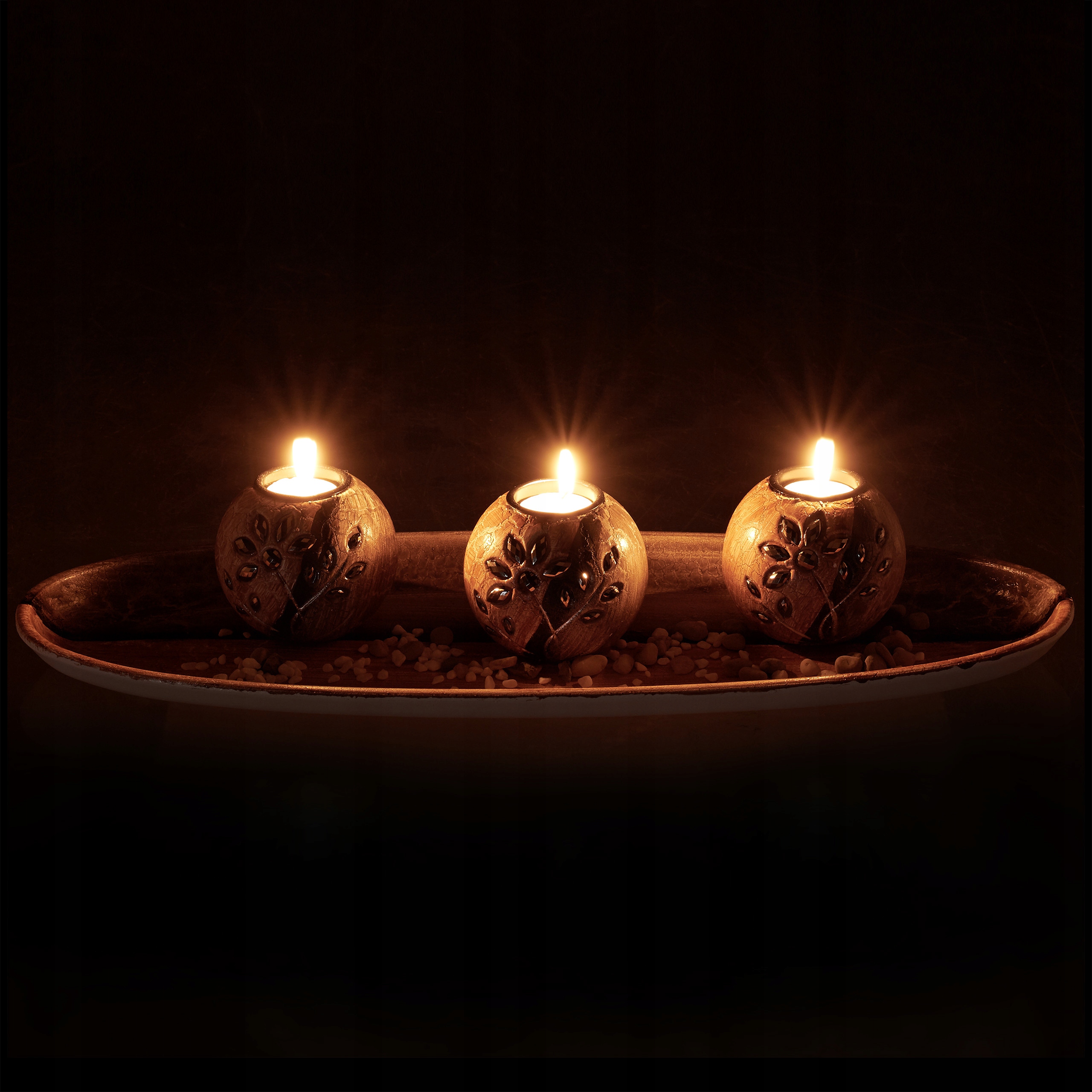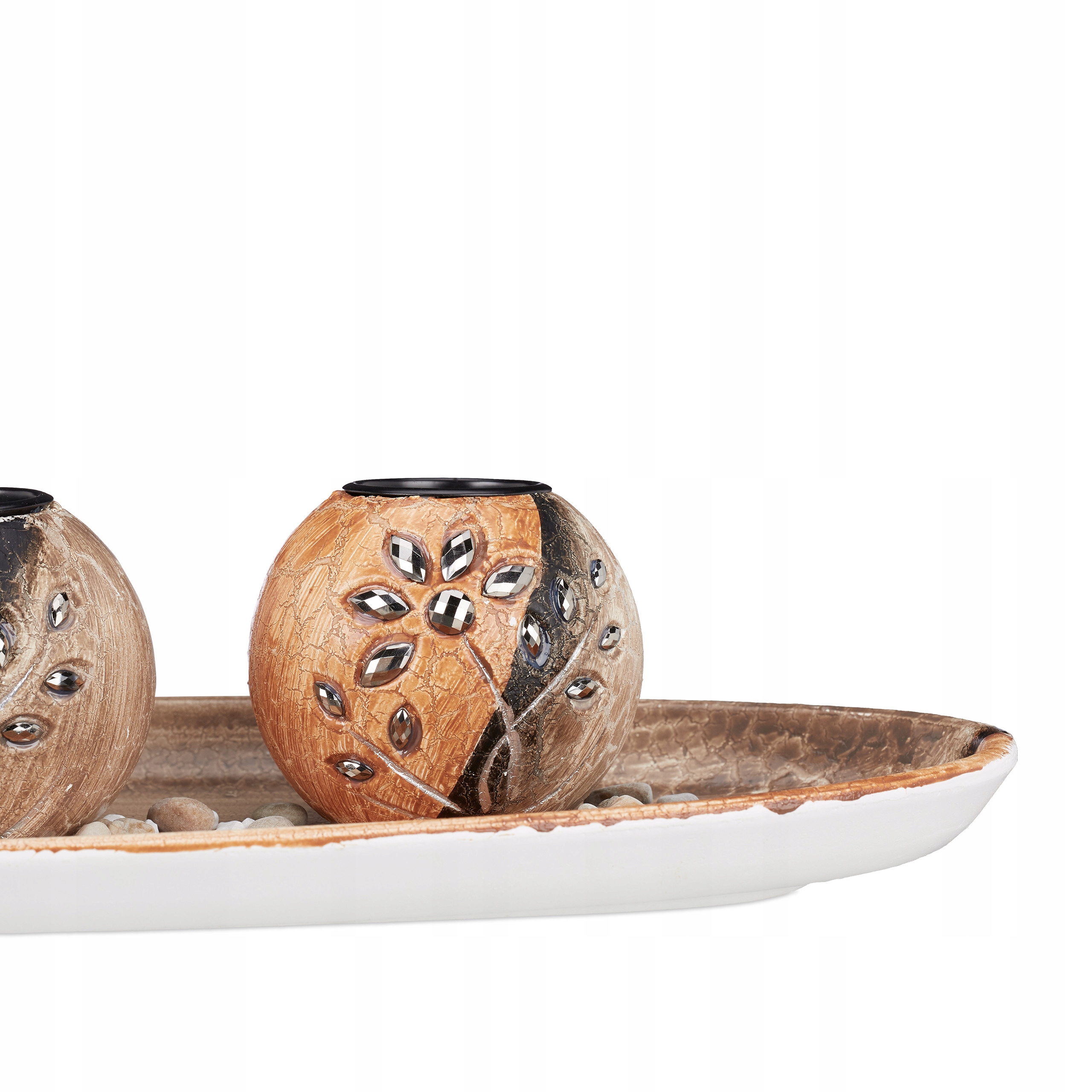 Stwórz przytulną atmosferę podczas posiłków, wieczorów filmowych czy romantycznych chwil dzięki temu zestawowi świeczników z podstawką. Naturalny wygląd w odcieniach brązu z dodatkiem kamyczków oraz małe, błyszczące kwiatki ze srebrnej mozaiki dodają elegancji i wyjątkowego charakteru każdemu wnętrzu.