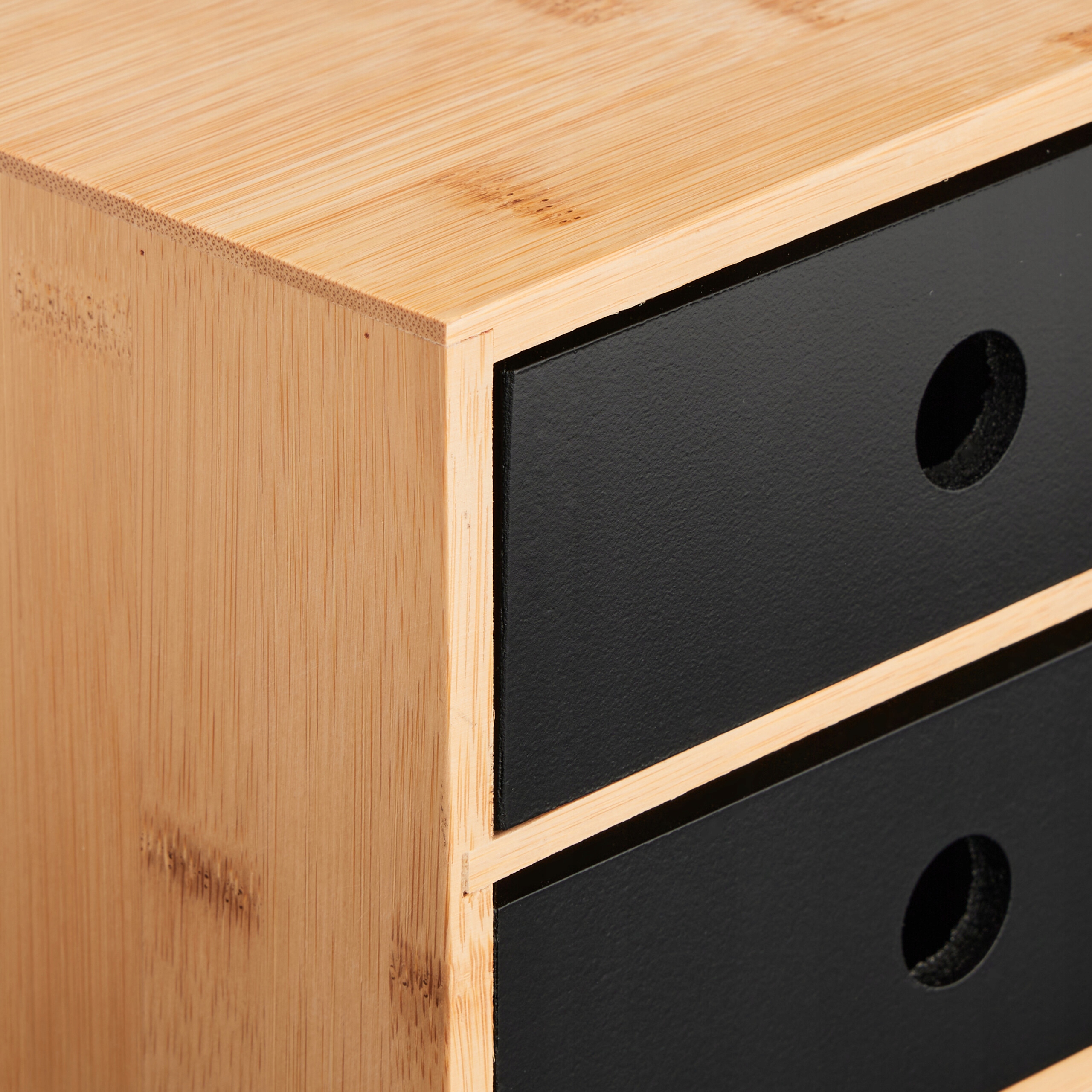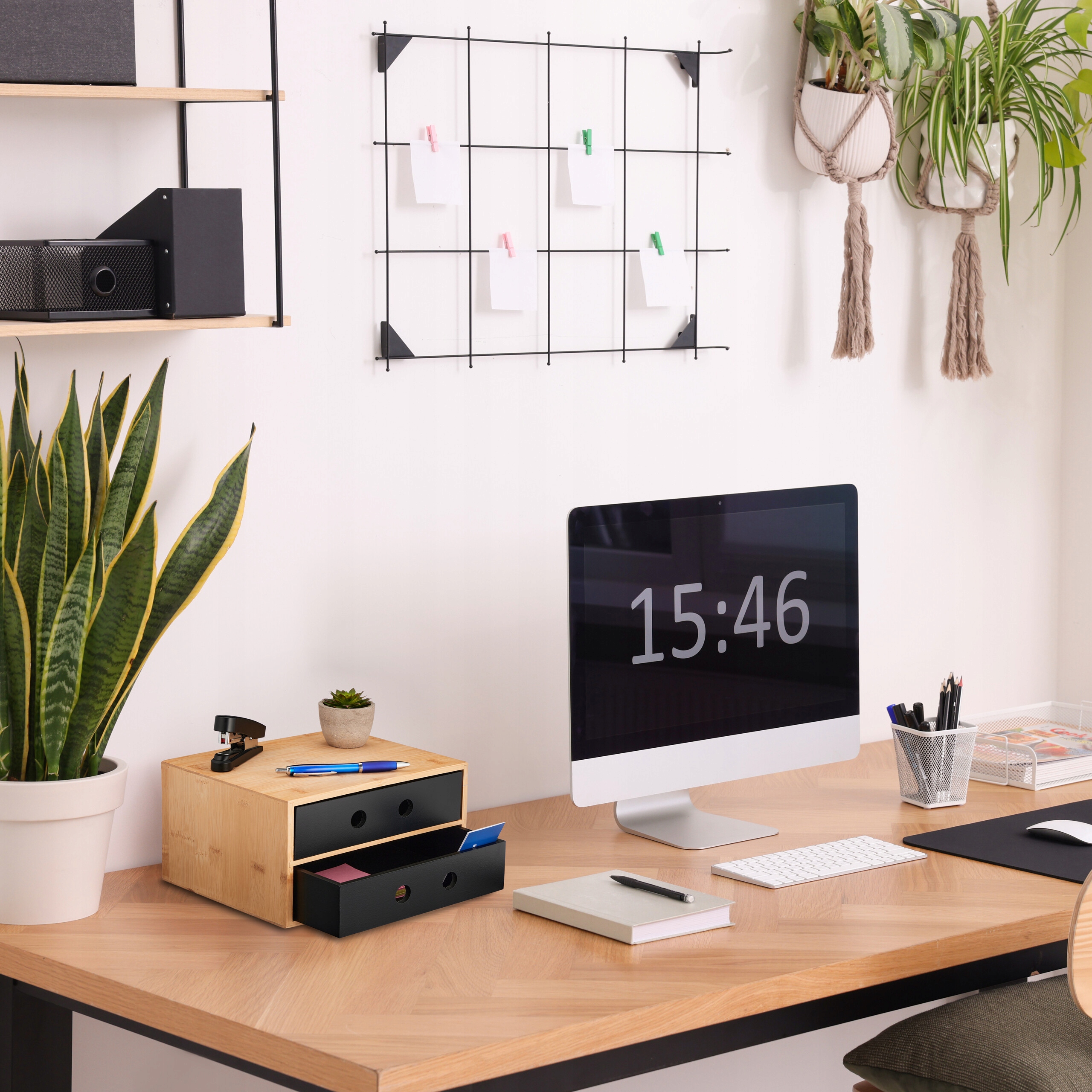 Mniejsze przedmioty szybko gromadzą się w domu lub biurze. Dzięki naszemu pojemnikowi na przybory możesz jednak temu zaradzić. Pojemny przybornik z 2 szufladami umożliwia przechowywanie kosmetyków, akcesoriów do włosów i innych przedmiotów w łazience. Organizer na biurko może być również używany do przechowywania przedmiotów biurowych, takich jak notatki lub długopisy. Dzięki naturalnemu usłojeniu i czarnym akcentom przybornik biurowy ma bardzo dekoracyjny efekt i przyciąga wzrok zarówno w biurze jak i gabinecie.