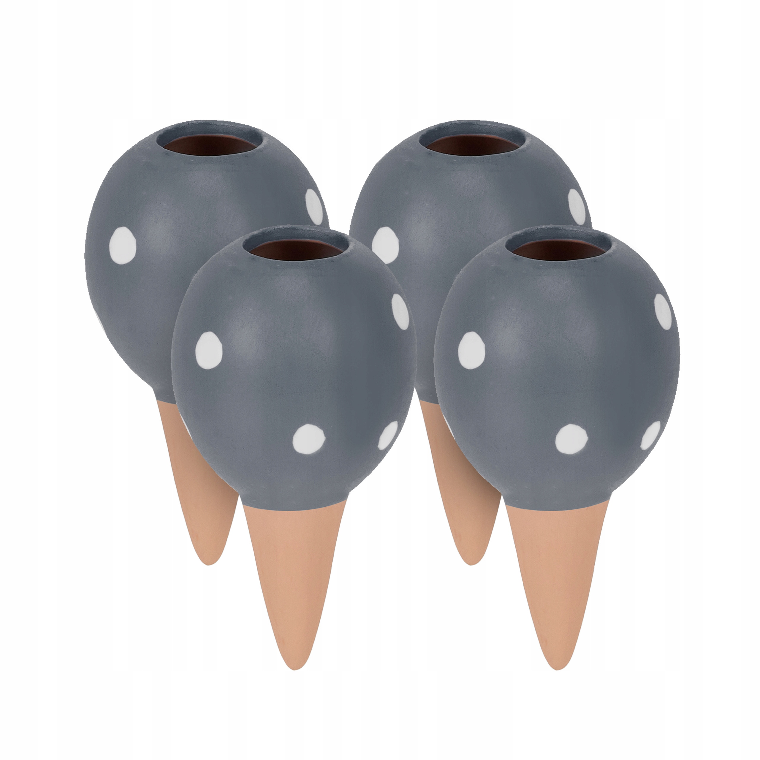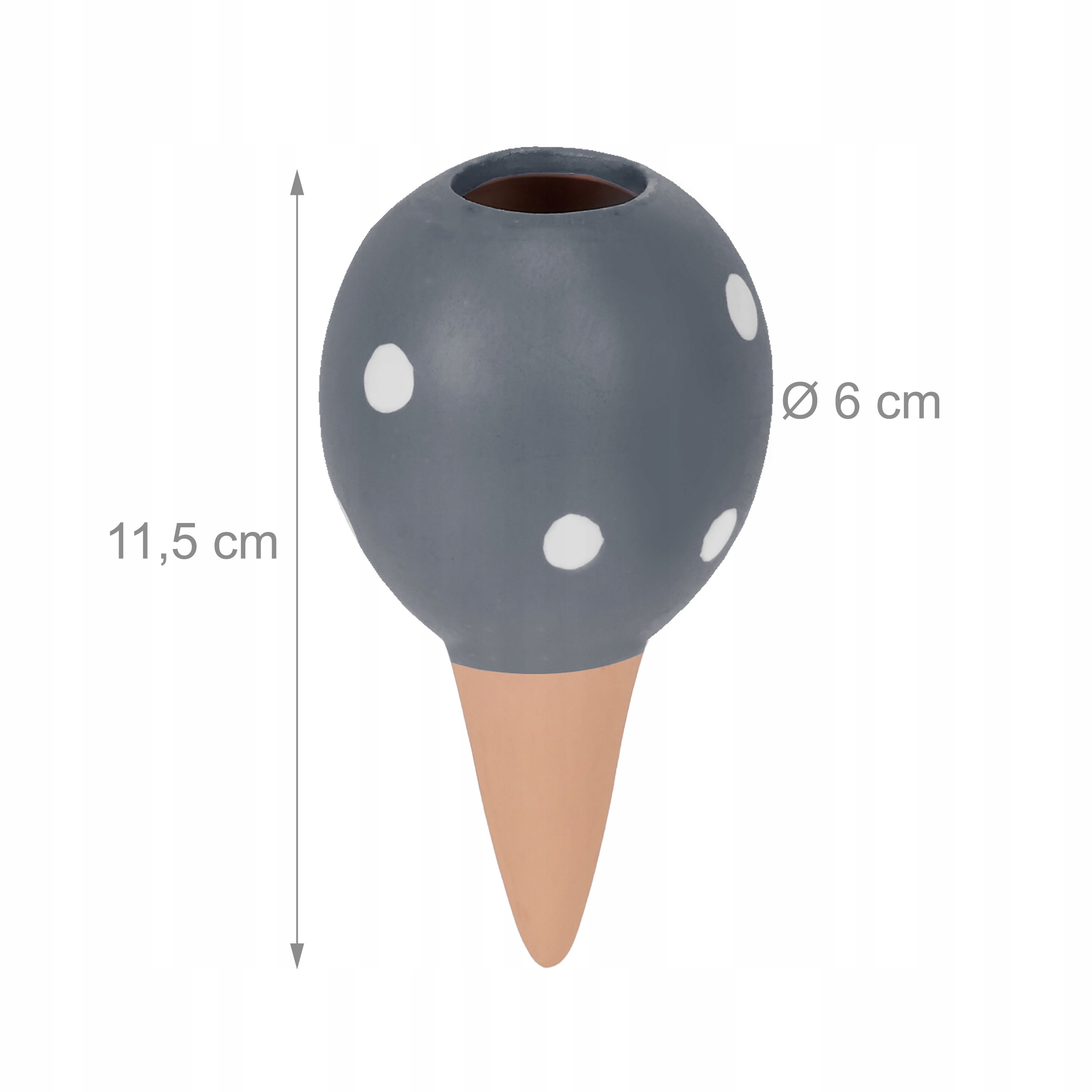 Dzięki tym rożkom na pewno nie będziesz się już martwić o podlanie Twoich kwiatów doniczkowych podczas upalnych dni lata. Wystarczy wbić praktyczne konewki do podlewania w glebę, a następnie napełnić je wodą. Gdy gleba staje się zbyt sucha woda przesiąka przez dozownik wykonany z przepuszczalnego materiału dzięki czemu zapewnione jest równomierne podlewanie. W mgnieniu oka uzyskasz prostą i skuteczną metodę nawadniania Twoich roślin. – wymiary: ok. 11,5 x 6 cm (wys. x śr.)- średnica otworu: ok. 2,5 cm- pojemność 1 dozownika: ok. 100 ml- waga każdego z uchwytów: ok 100 g- materiał: ceramika- kolor: terakota, szary, białyNawadniacz do podlewania roślin doniczkowych – system nawadniania kwiatów i roślin- odpowiednie dla roślin doniczkowych, skrzynek balkonowych i grządek- automatyczne zaopatrzenie w rośliny na kilka dni- z przepuszczającej wodę gliny do równomiernego dozowania- idealny na urlopowe wyjazdy, do biura lub dla zapominających o podlewaniu kwiatówW zestawie- 4x nawadniacz kwiatów- elementy dekoracyjne nie są zawarte w zestawie
