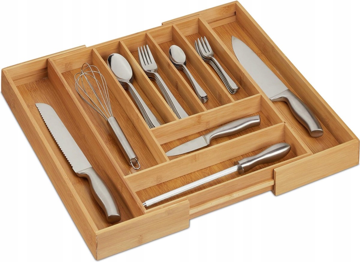 - nazwa typu elementu: Relaxdays bambusowy organizer do szuflady kuchennej wkład na sztućce rozsuwany 7 lub 9 przegródek 7,5×49,5×44,5 cm